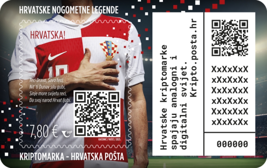 ZAGREB – Hrvatska pošta u suradnji s tvrtkama BitX i MarrowLabs predstavlja sedmu po redu hrvatsku kriptomarku. Kriptomarke su zamišljene kao savršena kombinacija analognog i digitalnog svijeta, a njima Hrvatska pošta filateliji daje novu dimenziju jer ovaj tradicijski sakupljački hobi uvodi u digitalno doba. Na prethodnoj kriptomarki motiv je bio najpoznatiji postolarski šegrt u Hrvatskoj – Šegrt Hlapić i njegova ekipa iz romana, a ove je godine čast pripala petorici veličanstvenih, nogometnim legendama: Bernardu Vukasu, Dražanu Jerkoviću, Zlatku Kranjčaru, Davoru Šukeru i Luki Modriću. Ovo je izdanje realizirano u suradnji s Hrvatskim nogometnim savezom. Nominalna vrijednost bloka iznosi 7,80 eura, a autori su izdanja zagrebački dizajneri Ivana Vučić i Tomislav-Jurica Kaćunić.