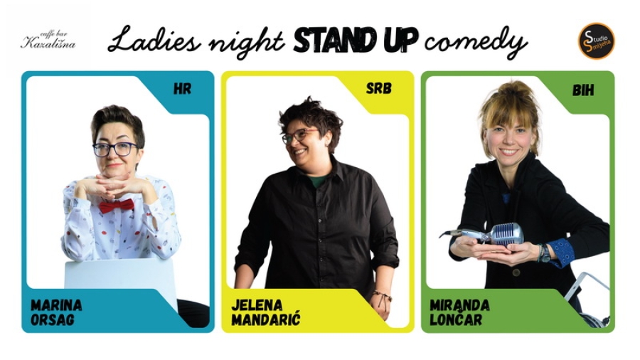 Večer vodi i otvara energija u ljudskom obliku — Marina Orsag, nosivi stup stand-up scene u Hrvatskoj. Gdje Marina stane, humor eksplodira. Njezina pozitiva i otvorenost toliko su prirodne da se publika osjeća kao da je u dnevnom boravku kod prijateljice koja sluša, razumije, a onda isporuči punchline koji pogodi ravno u solarni pleksus od smijeha i zagrije atmosferu za toplu dobrodošlicu Mirandi Lončar — beskompromisno svojoj, samostalnoj i žestokoj. Ženi koja, kad govori engleski, zvuči kao da prijeti na ruskom; pripadnici, a možda i osnivačici, ekstremne frakcije hercegovačke manjine u Zagrebu; ženi koja se jednom umalo okitila lentom Miss Bosne i Hercegovine, ali ju je jezik koštao titule… ili su to možda bile brčine. Miranda se liječi komedijom, ali ne bilo kakvom — njen humor je heavy metal, pun distorzije i bijega iz zone sigurnosti. A kad druge stanu — gas dodaje Jelena Mandarić. Na pozornici je kao u vlastitoj dnevnoj sobi, i baš zbog te ležernosti publika joj odmah povjeruje. U Studiju Smijeha napravila je svoje prve humoristične korake, a poslije je, zajedno s kolegicama iz Srbije, iznjedrila show Žene koje pričaju. Njezin lak i pitak humor uvijek završi u savršenom smijehu.