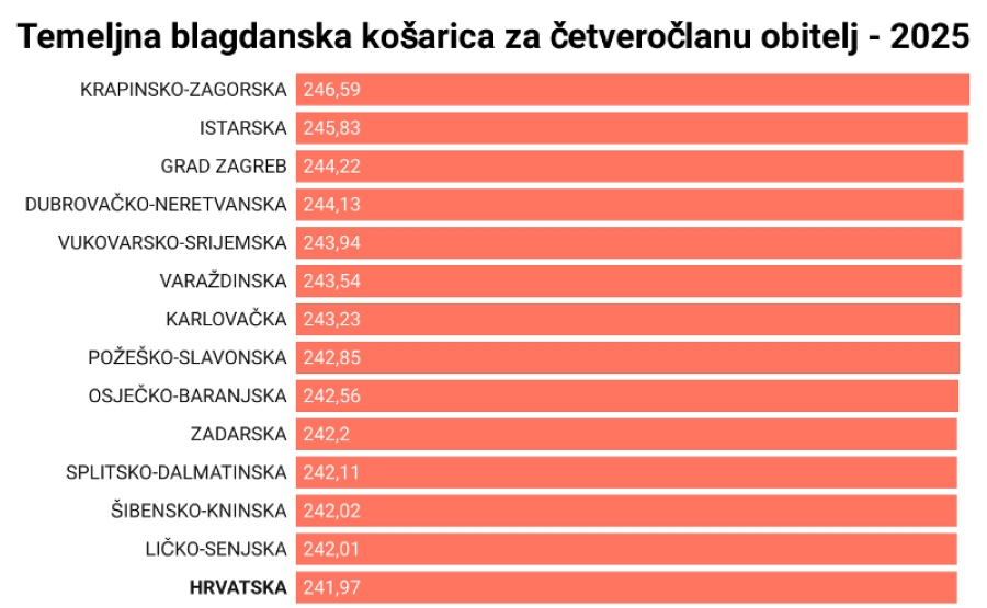 Najskuplja je Virovitičko-podravska županija s 351,98 eura, a prate ju Krapinsko-zagorska (349,88) i Dubrovačko-neretvanska županija (348,61). Ova je košarica najjeftinija u Koprivničko-križevačkoj (330,92), Ličko-senjskoj (335,2) i Brodsko-posavskoj županiji (336,84).