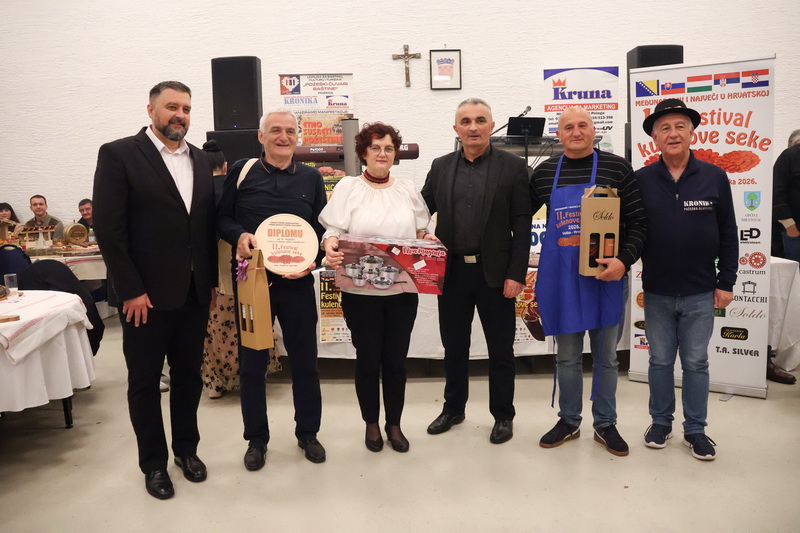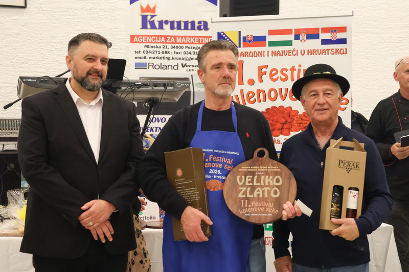 VELIKA - Ponovno rekordni i najveći do odaziv proizvođača kulenove seke, čak 134 uzoraka iz zaista cijele Hrvatske i tri susjedne države i ovaj 11. Festival kulenove seke 2026. ostavile su i dalje kao najveće natjecanje u Hrvatskoj i još jače Međunarodno natjecanje u kvaliteti debele sporo fermentirane kobasice. U zaista velikom stilu održan je 11. Festival kulenove seke u Vatrogasnom domu DVD Velika uz nazočnost preko 400 proizvođača, posjetitelja i uzvanika, uz izbor Ljepotice kulenove seke, najljepšeg etno i gastro stola, izbor najbolje kulenove seke po izboru posjetitelja i naravno ocjenjivanje najboljih kulenovih seka po ocjeni stručnog povjerenstva.
