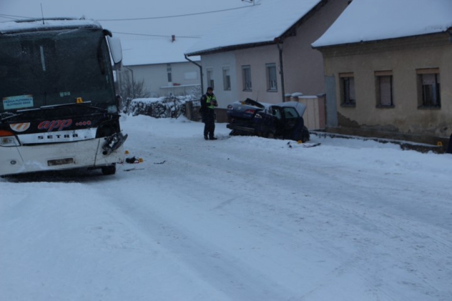 KUZMICA - Teška prometna nesreća dogodila se jutros oko 5,45 sati u Srednjem selu. Seat Cordoba kretao se iz pravca Pleternice i iz neutvrđenih je razloga udario u autobus koji je dolazio iz suprotnog pravca.