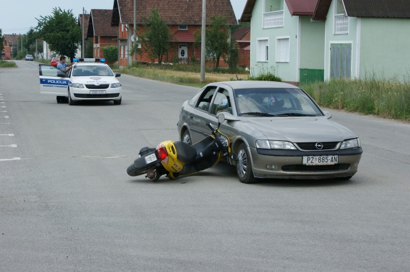 U utorak, 9. lipnja, oko 13.15 sati, u Pleternici, u Ulici Ante Starčevića, 31-godišnji vozač koji je upravljao moped marke „Kymco“, požeških registarskih oznaka, uključivao se u promet prilikom čega nije propustio sva vozila te je udario u osobni automobil marke „Opel“, požeških registarskih oznaka, a kojim je upravljala 23-godišnjakinja. U prometnoj nesreći 31-godišnjak je lakše ozlijeđen i protiv njega slijedi prekršajni nalog.
