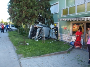 POŽEGA – Teška prometna nesreća dogodila se desetak minuta iza 19 sati u Ulici Hrvatskih branitelja kod kućnog broja 153, u kojoj su teže ozljede zadobili vozač i suvozač iz osobnog automobila Renaul Clio. Uslijed velike brzine vozač je izgubio nadzor nad vozilom, prije toga započevši skretanje iz Mlinske ulice u desno, te se velikom brzinom zabio u trgovinu Ena, a nakon toga zaustavio na stablu smreke. Prilikom udara u prodavaonicu polomio je ulazna vrata, izlog, a u prodavaonici učinio veliku štetu razbivši PC blagajnu, pult i rashladnu vitrinu. Prilikom rotiranja vozila napravio je štetu na fasadi zgrade, a u rotaciji je udario u smreku na dva metra visine i pao na bok podno smreke.