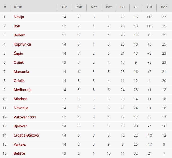 Slavija se iz Vukovara vraća s punim plijenom te i dalje ostaju pri vrhu i borbi za naslov prvaka. Pobjedu pleterničanima donijeli su Matej Peharda koji je zabio u 30. minuti, a pred kraj susreta potvrdu za tri boda donio je Šubara. Slavija je tako nakon 13. kola jedina momčad sa jednim porazom u sezoni i moglo bi tako ostati do kraja jesenskog dijela. U sljedećem kolu Slaviji stiže pretposljednja momčad Varteks iz Varaždina, a zadnje kolo gostovanje kod posljednje momčadi Belišća. Slavija se nalazi na četvrtom mjestu s 24 osvojena boda.