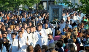 VOĆIN - Na blagdan Gospe Voćinske 21. kolovoza središnje večernje euharistijsko slavlje u Voćinu predvodio je požeški biskup Antun Škvorčević s brojnim svećenicima, đakonima, redovnicima i redovnicama, te nekoliko tisuća vjernika koji su stigli pješice kao hodočasnici iz svih područja Požeške biskupije, iz cijele Požeštine, iz Brodsko–posavske županije, od Davora, Nove Kapele, Starog Petrovog Sela, Nove Gradiške, iz Bjelovarsko-bilogorske županije s područja Daruvara i Đulovca, iz Virovitičko-podravske županije od Slatine, Orahovice i drugim mjesta.