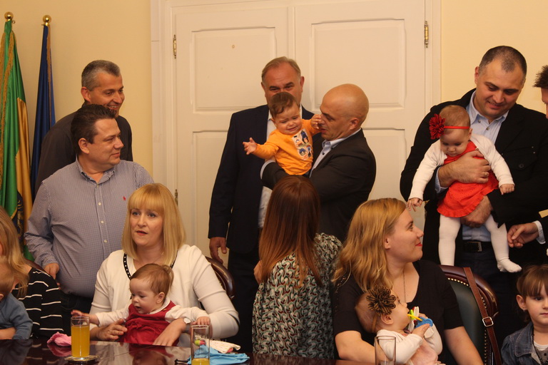 Dječji glasovi i plač često nadjačaju glas gradonačelnika, a svoje prve čestitke najmlađima izrekao je požeški gradonačelnik Darko Puljašić, zaželjevši im sretno djetinjstvo i lijepo odrastanje u Gradu prijatelju djece te najavio da će se već kod slijedećeg prijema najmlađih stanovnika u gradu Požegi dječji vrtić u potpunosti otvoriti. Dobrim željama su se pridružili dogradonačelnici Mario Pilon i Ferdinand Troha.