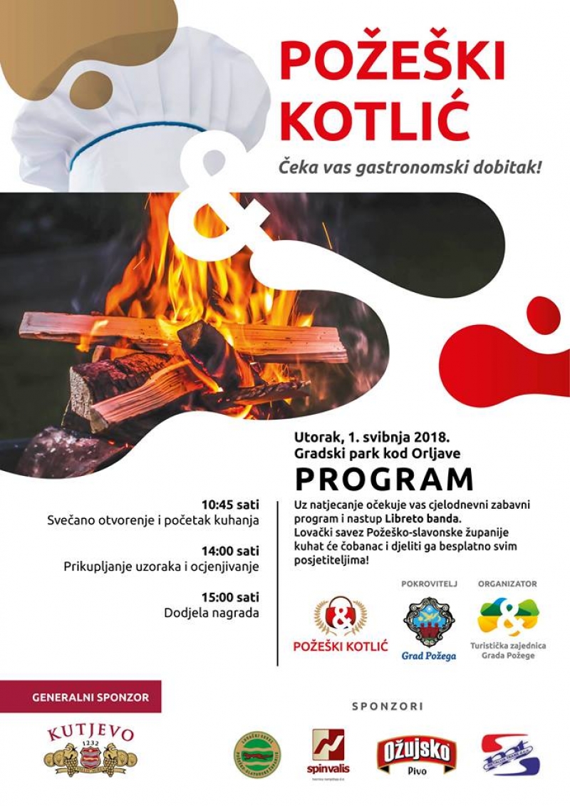 POŽEGA - Tradicionalno natjecanje u kuhanju slavonskog čobanca, popularni „Požeški kotlić" i ove će se godine održati na Međunarodni praznik rad - 1. svibnja, u parku pokraj Orljave. Deseti po redu Požeški kotlić danas su na konferenciji za novinare predstavili požeški gradonačelnik Darko Puljašić, direktorica Ureda TZ Silvija Podoljak i predsjednik Lovačkog saveza Požeško – slavonske županije Branko Bertelović.