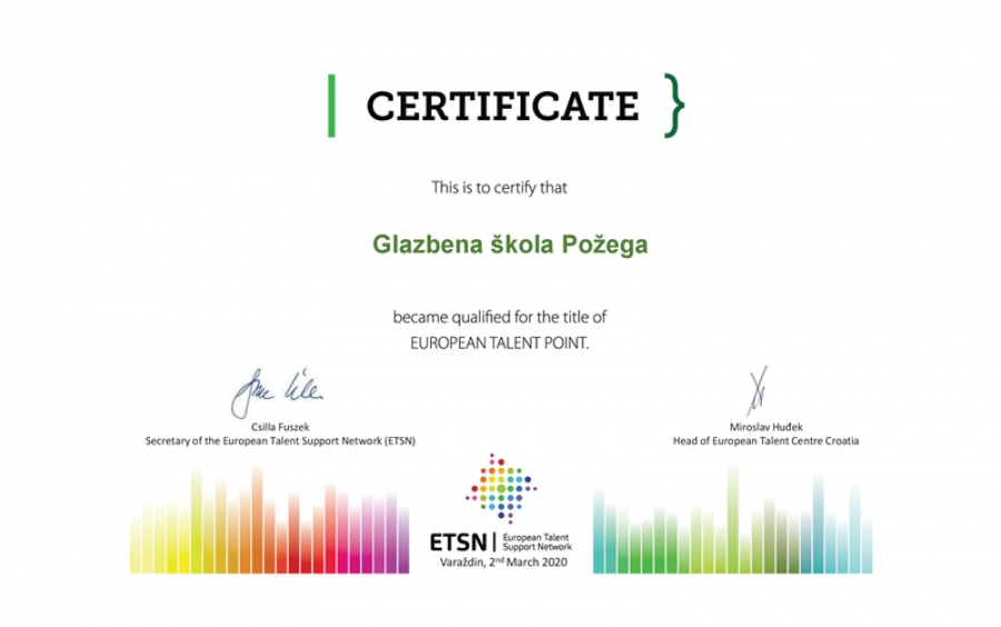 POŽEGA - Priprema i razvoj profesionalne karijere mladog glazbenika dugotrajan je i posvećen proces od predškolske dobi do prvog zaposlenja. Kroz svoje neprekinuto pedesetogodišnje djelovanje, nastavnici i djelatnici u Glazbenoj školi Požega prepoznali su i pružali razne oblike podrške darovitim učenicima. U organizaciji Europskog talent centra Hrvatska i Povjerenstva za procjenu kandidature za europske točke za darovite, 8. 10. 2020. Glazbena škola Požega primila je certifikat i postala Europska točka za darovite (ETP) i tako se uključila u Europsku mrežu za podršku za darovite (ETSN).