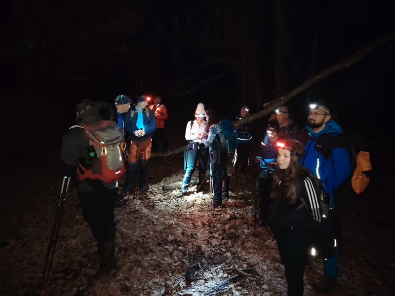 Nakon početnog napora nastavili su se kretati relativno ravnom šumskom stazom, punom srušenih stabala koja su morali zaobilaziti. Uz naglavne lampe koje su koristili za osvjetljavanje staze, pun mjesec im je olakšao vidljivost kako bi se što lakše kretali. Stigavši na vrh Klikuna napravili su dužu pauzu za odmor i okrijepu, posjedavši na drvene klupe koje se tamo nalaze. Zadovoljni i puni dojmova od nesvakidašnjih noćnih pejzaža, popili su topli čaj, nešto pojeli i odmorili se. Kako je noć bila hladna brzo su nastaviti s hodanjem, jer samo tako su mogli zadržati radnu temperaturu. Vodič Stjepan Lovrenčić poveo ih je sigurnom nogom i velikom voljom u Laze Prnjavor te dalje prema Seocima. Tu su napravili kraću pauzu za odmor i uživanje na ljuljačkama, a onda su nastavili spustivši se cestom do Jagodnjaka. Stigavši na gradski asfalt nastavili su pješice do Trga Sv. Trojstva i spomenika kugi. U centru grada ispred spomenika Presvetom Trojstvu napravili su zajedničku fotografiju prije rastanka, a onda su krenuli kućama svatko na svoju stranu.