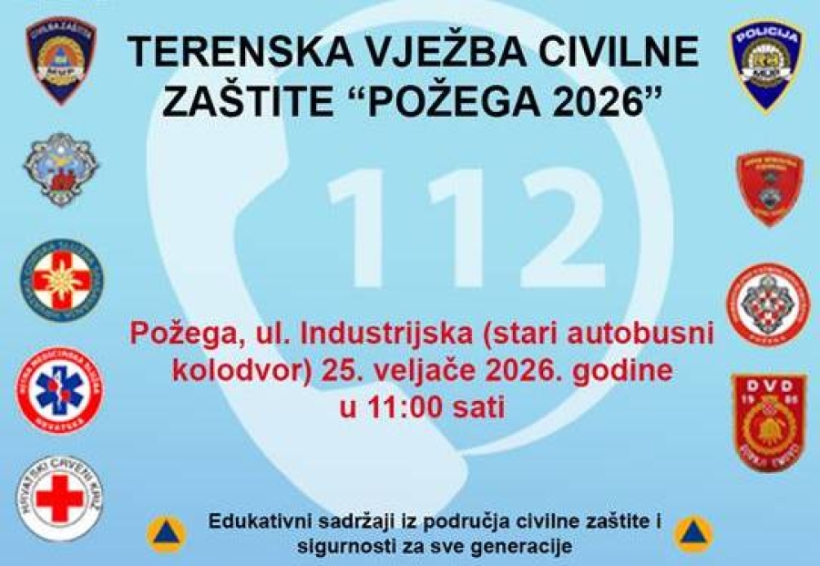 Ove godine vježba se provodi na području Grada Požege 25.02.2026., pod nazivom „POŽEGA 2026.“,s početkom u 11,00 sati, na lokaciji stari autobusni kolodvor u Ulici Dtjepana Radića.
