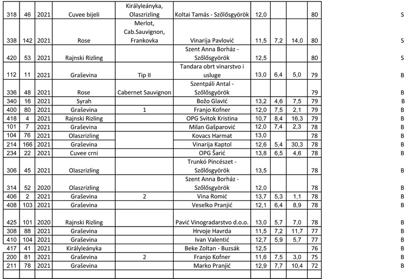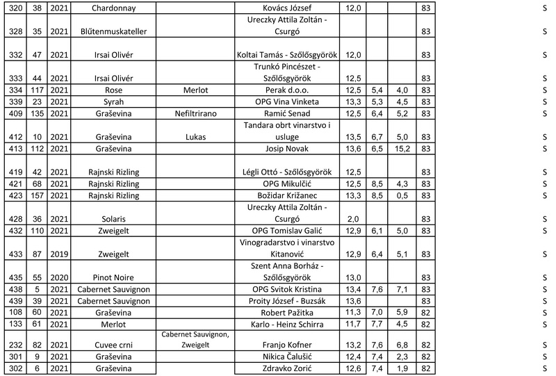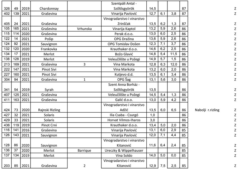Vinarija Perak iz Kutjeva osvojila je i titulu najbolje ocjenjene mlade graševine za svoju Graševinu berbe 2021. Najbolje ocijenjeno crno vino je Syrah, berba 2019. g. Veleučilišta u Požegi. Najbolje ocijenjeno vino na 8. Međunarodnom ocjenjivanju vina je Tramini, berba 2019., vinarije Szent Anna Borhaz iz mađarskog Szolosgyoroka. Najbolje ocjenjeno vino na 6. Međužupanijskom ocjenjivanju je vino Cabernet Sauvignon, berba 2017. g., vinarije Ker-Vin vl. Tome Galića iz Nadina. Najbolji ocjenjeni Pinot sivi je Vinarije OPG Cvekan, berba 2019. g. Ivana Cvekana iz Đurđevca. Najbolje ocijenjeni Sauvignon je onaj Vinarije Kaptol, berba 2020. godine. Najbolji Rajnski rizling je Vinarije Adžić iz Kutjeva, berba 2020. g. Najbolji Chardonay je iz Vinarije Pavić, berba 2020. g., vlasnika Denija Pavića iz Vetova. Najbolje ocjenjeni Rose je Planina Borhaz, berba 2021. iz Mohača, Mađarska. Najbolje ocijenjeni Merlot je Vina Markota, berba 2017. Vinarije Markota iz Pleternice.