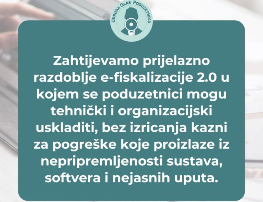 ZAGREB - Udruga Glas poduzetnika (UGP) poziva Vladu Republike Hrvatske da uvede prijelazno razdoblje prilagodbe za Fiskalizaciju 2.0 u trajanju od najmanje šest mjeseci, tijekom kojeg se ne bi izricale kazne poduzetnicima.