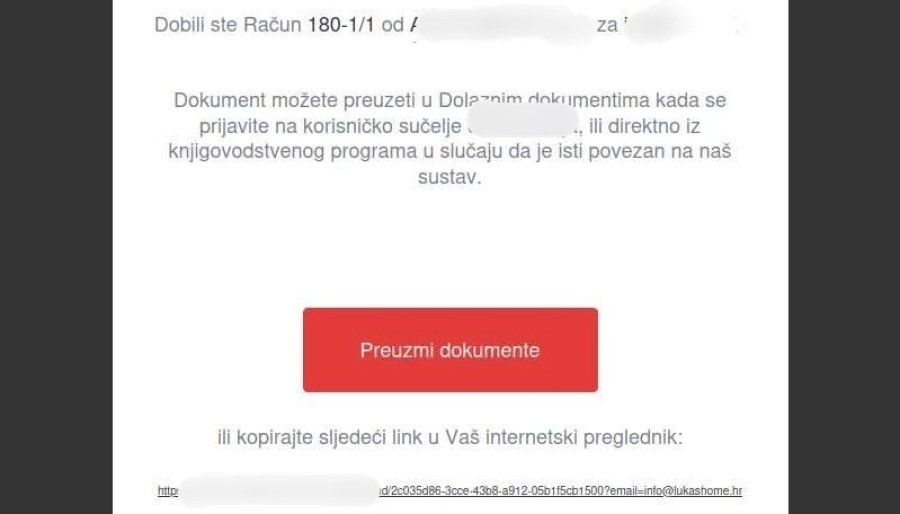 Riječ je o porukama koje izgledaju kao legitimne obavijesti o zaprimljenom dokumentu, najčešće računu ili otpremnici te sadrže gumb poput „Preuzmi dokumente“. Vizualno su vrlo uvjerljive i na prvi pogled ih je teško razlikovati od stvarnih poruka koje građani i poslovni subjekti svakodnevno primaju.