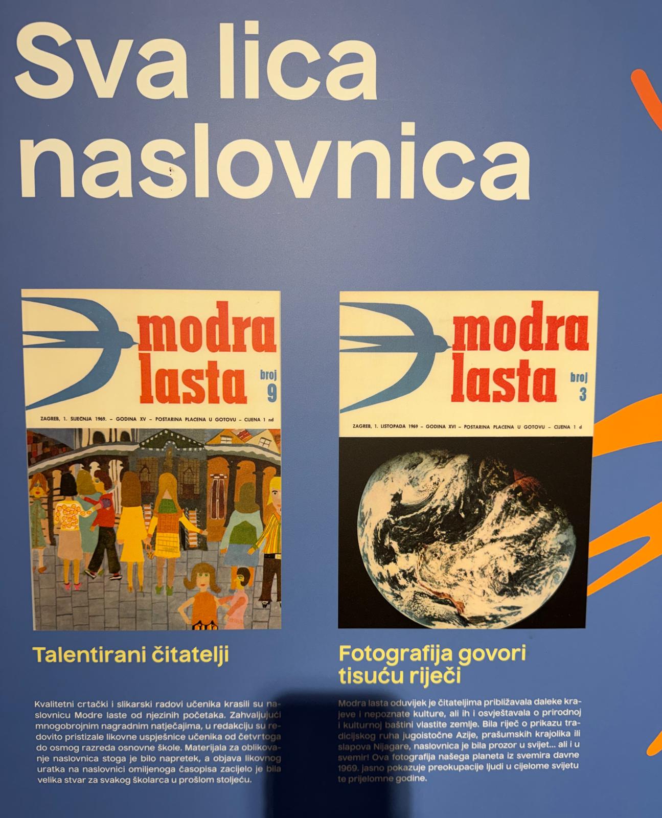 U fondu Nacionalne i sveučilišne knjižnice u Zagrebu pohranjena su sva izdanja Modre laste, časopisa koji je oblikovao naraštaje mladih. Na ovoj izložbi prisjetit ćemo se tih izdanja, a uz primjerke iz fonda NSK, izložbene panoe, dokumentarni film Irene Škorić i druge interaktivne sadržaje te radionice koje će nam pripremiti autorice tijekom trajanja izložbe, pokušati prezentirati nastanak i razvoj časopisa u koji je utkano znanje brojnih stručnjaka iz različitih područja djelovanja.