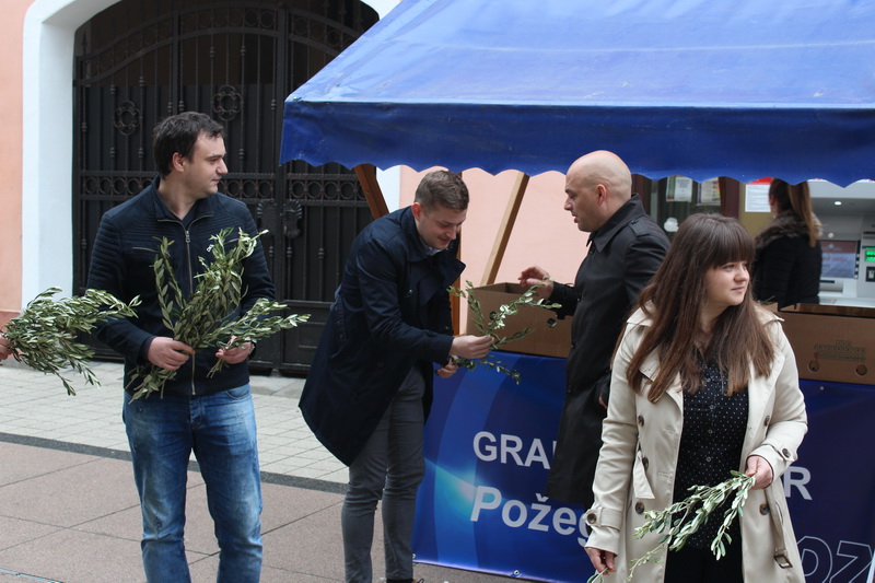 POŽEGA - Članovi Mladeži GO HDZ Grada Požege danas uoči Cvjetnice građanima dijelili maslinove grančice u šetališnoj zoni. Ovoj akciji pridružio se i predsjednik Gradskog odbora Darko Puljašić.