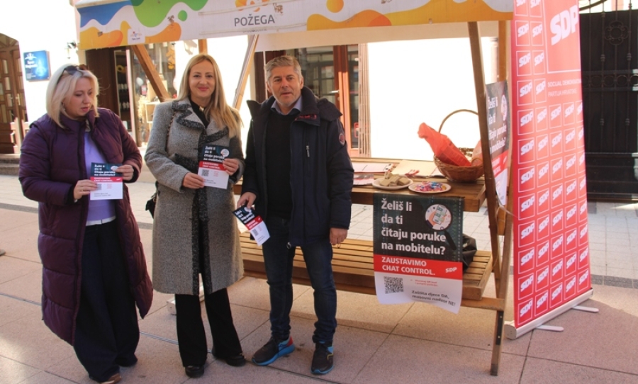 POŽEGA - U pješačkoj zoni grada Požege SDO grada Požege organizirao je info štand i orosvjed na temu "Recimo NE uhođenju građana!", kako bi zajedno podigli glas protiv prijedloga EU uredbe, tzv. „Chat Control.“