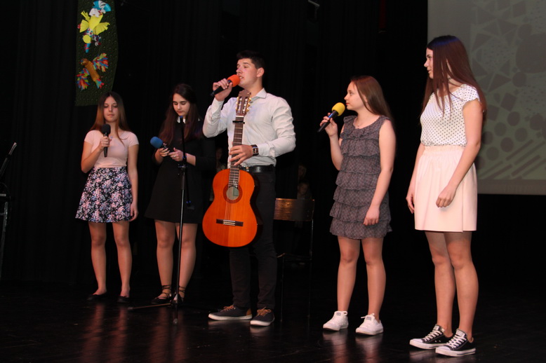 Kako je tu svečanost vidjela jedna od voditeljica doznajemo iz njenog opisa: - Kada nam je razrednica Vesna Leopoldović, koja je ujedno bila i koordinatorica proslave Dana škole, najavila da ćemo mi, osmaši, biti voditelji, bili smo posebno ponosni, ali i svjesni da je na nama velika odgovornost i da trebamo dati sve od sebe. Završna priredba bila je organizirana u Gradskom kazalištu u večernjim satima. Kazalište je bilo puno posjetitelja. Tema cjelokupnog programa bila je glazba koja se utkala u različite izražaje stvaralaštva. Na pozornici smo mogli vidjeti učenike od prvog do osmog razreda u različitim izvedbama od igrokaza, monologa, pjesama uz pratnju gitare, malog i velikog zbora, plesnih točaka do ritmičke gimnastike. Sve je bilo živo, dinamično, točke su se izmjenjivale jedna za drugom i sve je tako brzo prošlo. Posjetitelji su uživali, a mi se nadamo da smo opravdali vaše povjerenje i da smo bili uspješni voditelji. Nositelje programa, nastavnice Danijelu Petrinić-Milosavljević i Vesnu Leopoldović posebno smo nagradile izlaskom na pozornicu i malim znakom zahvale. Hvala i svim drugim mentorima jer bez njih ne bismo imali ovako uspješnu priredbu –opisala je Nina Klarić, učenica 8.a, i uspješna voditeljica programa.