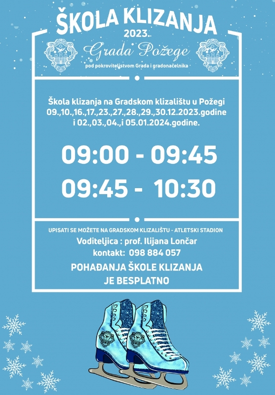 Voditeljica Škole klizanja je i ove godine profesorica Ilijana Lončar, a sve informacije se mogu dobiti na broj 098 884 057. Upisi su mogući i dalje, a pohađanje Škole klizanja je potpuno besplatno za sve polaznike.