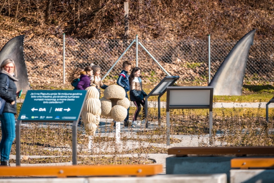 Vanjski prostor prilagođen je više odmoru, ali i svojevrsnoj provjeri znanja kroz labirint da/ ne pitalicama. Popraćen je zanimljivim skulpturama i objašnjenjima na edukativnim pločama. Tamo se osim zelenog labirinta mogu vidjeti skulpture nosoroga i simbolični prikaz stvarne veličine morskog psa Charcharodona megalodona, spiralu vremena, meteokartu. Također, nakon edukativnog dijela djeca mogu uživati na dječjem igralištu i odmorištu sa stolovima i klupama.