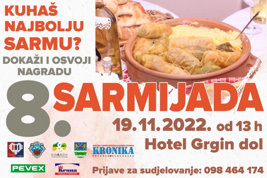 POŽEGA – Svi koji vole kuhati ali i ljubitelji sarme – kraljice slavonskog stola dolaze na svoje, jer Udruga Požeški čuvari baštine i tjednik Kronika požeško-slavonska organiziraju još jednu gastro manifestaciju ove godine 8. Sarmijadu – natjecanje za pripremanje najbolje sarme. Sarmijada se održava u subotu 19. studenog od 13 sati u Hotelu Grgin dol. Pozivaju se svi koji žele učestvovati da dođu sa svojim najbolje pripremljenim i skuhanim uzorcima sarme, koja može biti u stotinu varijanti, od one sa svinjskim mesom, miješanim mesom, mesom od divljači, svatovskom sarmom, sarmom u vinovu listu, sarmom u svježem kupusu, sarmom kakvu prave razni krajevi naše domovine i zavičajna društva stanovnika koji su naselili u prošlosti ove lijepe krajeve Požeštine, sarmom u listu raštike, ali i posnom i vegetarijanskom sarmom kakva se pravila u vrijeme posta i kakvu danas pripremaju vegetarijanci.