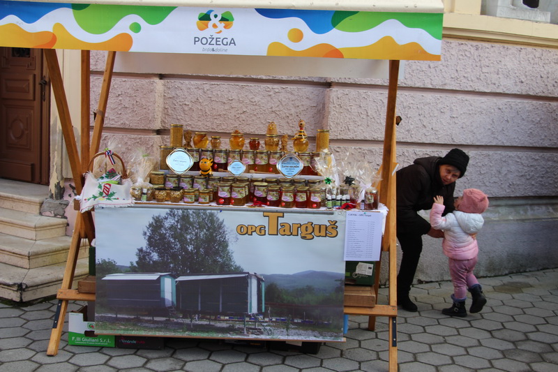 POŽEGA - U pješačkoj zoni grada Požege održan je i treći dan Adventskog i Božićnog sajma s dvadesetak štandova koji su imali bogatu ponudu autohtonih proizvoda OPG-a i malih poduzetnika i obrtnika, od meda i mednih proizvoda, sireva, pekmeza, suhog voća, suhomesnatih delicija, rukotvorina i ručnih radova, drvenih kućanskih potrepština, narodnih nošnji, šešira i slavonskih reklji, suvenira, božićnih ukrasa i dr.