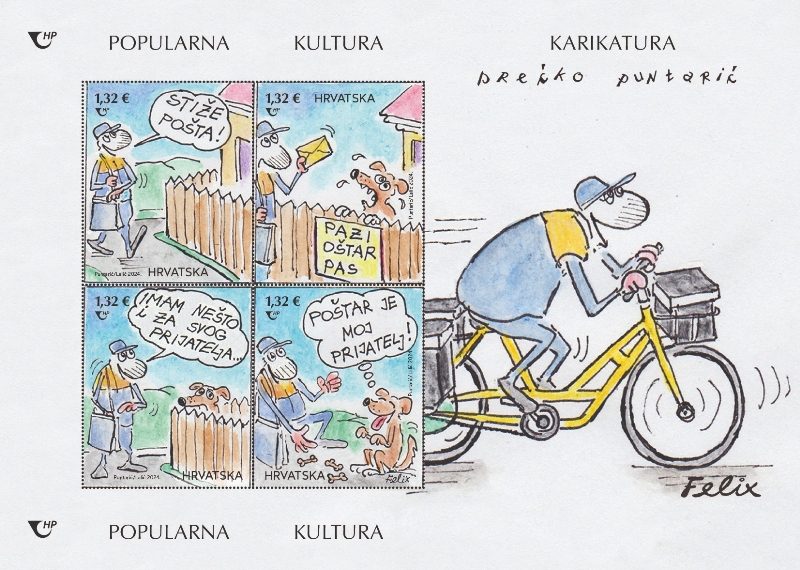 ZAGREB – Hrvatska pošta pustit će u optjecaj sutra, 21. veljače novi prigodni poštanski blok iz serije „Popularna kultura“. Ove je godina tema izdanja karikatura, a motiv na bloku je karikatura poštara i psa nastala olovkom poznatog hrvatskoga karikaturista Srećka Puntarića koji već pola stoljeća uveseljava ljude domišljatim, jedinstvenim, pametnim i prepoznatljivimFelixom. Autorica marke nominalne vrijednosti 1,32 eura je Alenka Lalić, dizajnerica iz Zagreba. Marka je izdana kao prigodni poštanski blok koji se sastoji od četiriju maraka, a otisnut je u nakladi od 20.000 primjeraka. Hrvatska pošta izdala je i prigodnu omotnicu prvog dana (FDC).