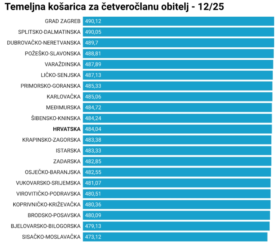 Najskuplji su Zagreb (490,12), Splitsko-dalmatinska županija (490,05), Dubrovačko-neretvanska županija (489,70 i Požeško-slavonska 488,81 eura. Najpovoljnije su Sisačko-moslavačka (473,12), Bjelovarsko-bilogorska (479,13) i Brodsko-posavska županija (480,09). Razlika između najskuplje i najjeftinije temeljne košarice za četveročlanu obitelj iznosi 17 eura.