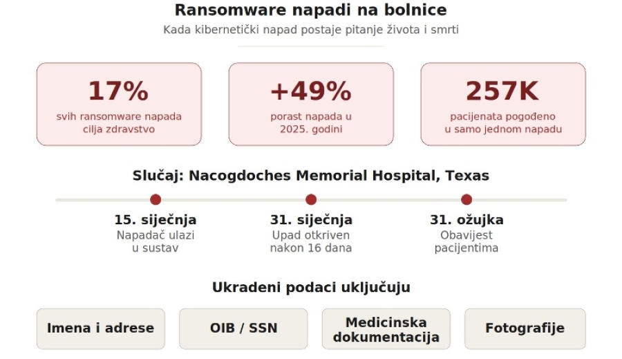 Ovih dana pažnju stručne javnosti privukla su dva značajna slučaja iz Sjedinjenih Američkih Država. Nacogdoches Memorial Hospital u Teksasu objavio je da je u kibernetičkom napadu kompromitirano više od 257.000 osobnih i medicinskih zapisa pacijenata. Među ugroženim podacima nalaze se imena, adrese, brojevi socijalnog osiguranja, medicinska dokumentacija pa čak i fotografije. Posebno zabrinjava podatak da je napadač imao pristup sustavu puna dva tjedna prije nego što je neovlašteni upad uopće otkriven.